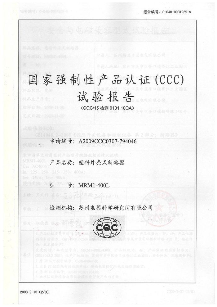 MRM1-400L塑殼斷路器資質(zhì)證書(shū)
