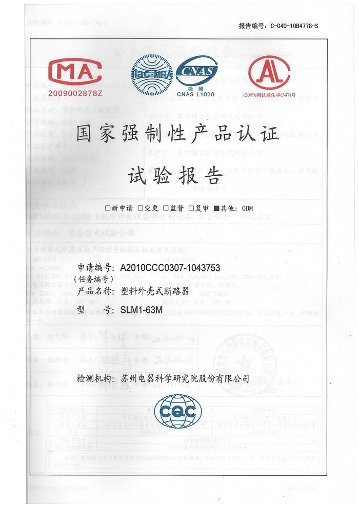 SLM1-63M塑殼斷路器資質(zhì)證書