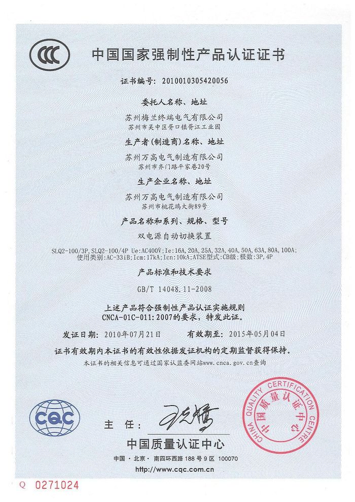 SLQ2-100雙電源資質(zhì)證書(shū)