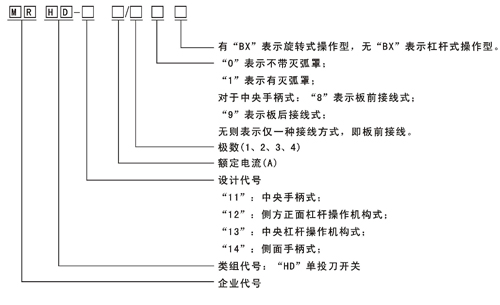 MRHD系列單投刀開(kāi)關(guān)適用于交流50Hz、額定電壓至380V、直流至220V,額定電流至3000A的成套配電裝置中,作為不頻繁地手動(dòng)接通和分?jǐn)嘟?、直流電路或作隔離開(kāi)關(guān)用。其中: